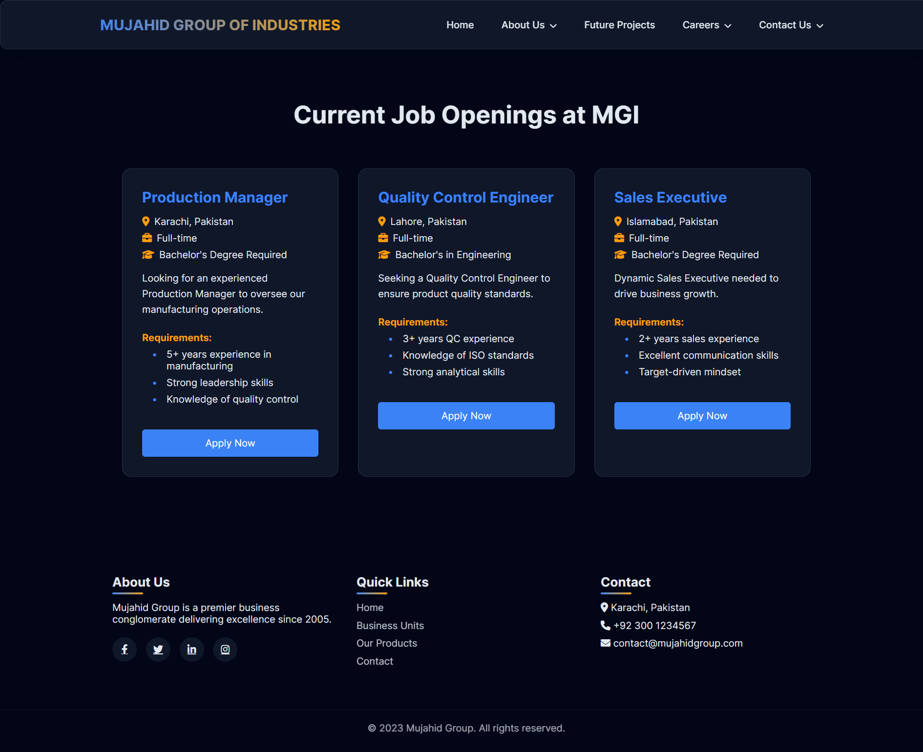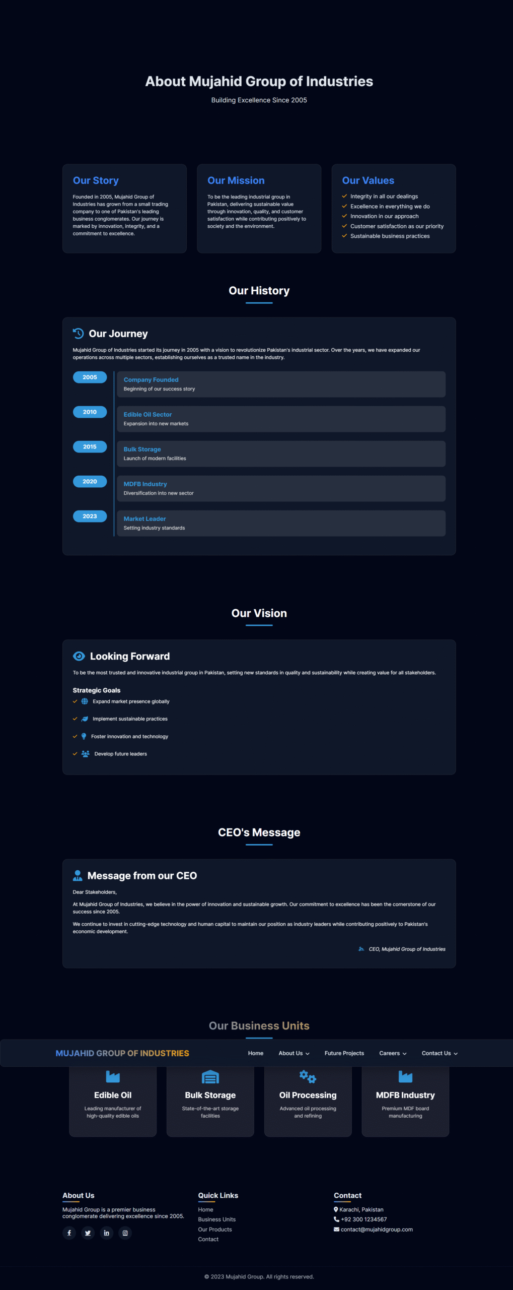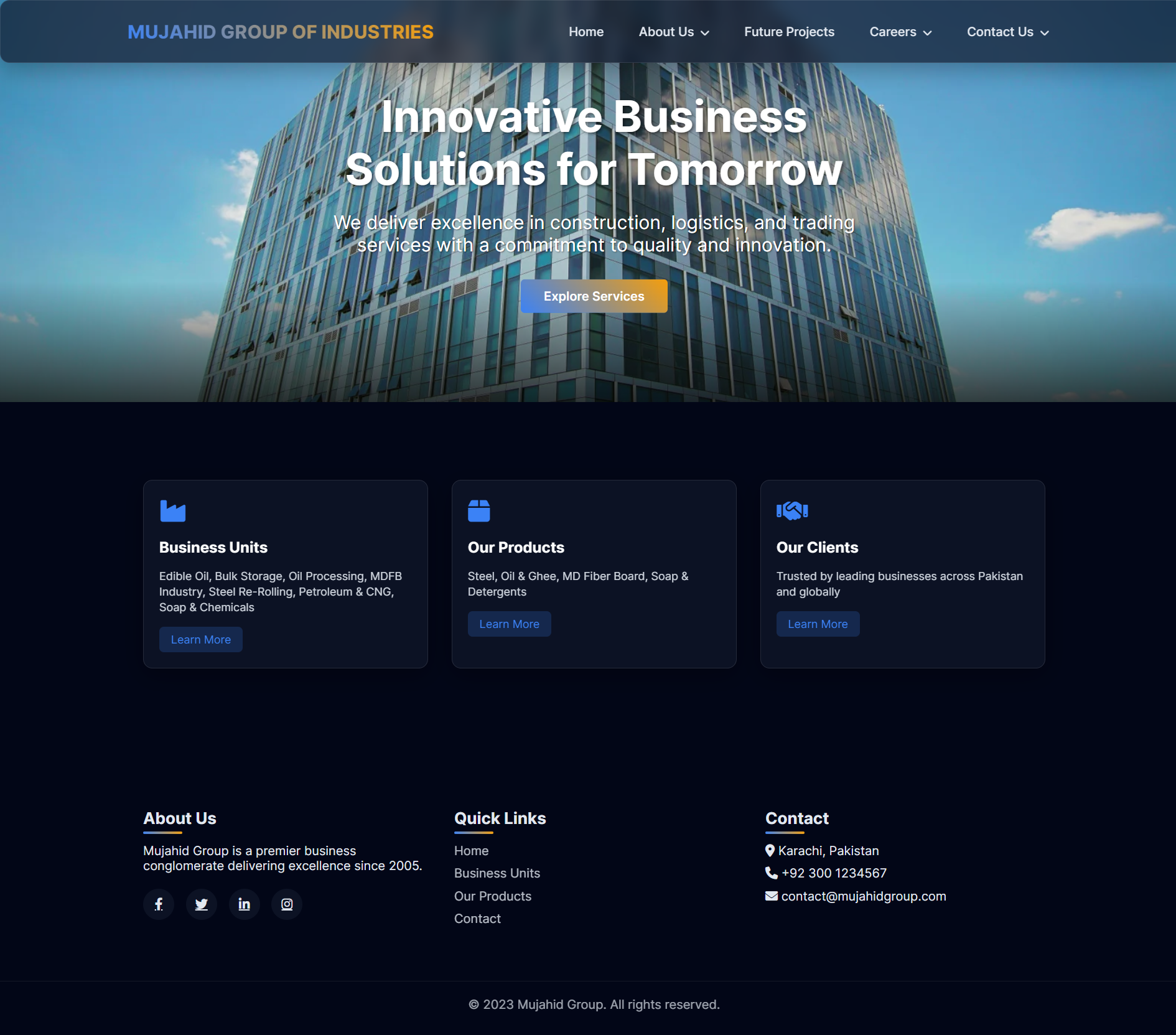 Mujahid Group of Industries – Complete Corporate Website Development. A comprehensive business website for a leading industrial conglomerate with multiple business units including edible oil, steel, MDFB, and petroleum services.